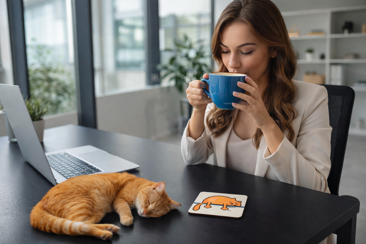 "This Orange Sleepy Cat Coaster features a cute cartoon ginger cat lazily hanging over an edge, making it a cozy and humorous gift for cat lovers."
